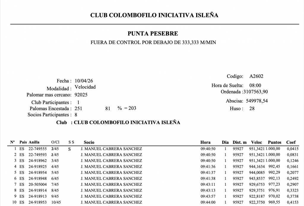 El equipo de vuelo de J. Manuel Cabrera repite podio. Otra serie espectacular ocupando Las 10 primeras plazas de la lista de resultados. Tres palomas en el mismo segundo, 09:40:50 y una velocidad de 951.34 mpm
